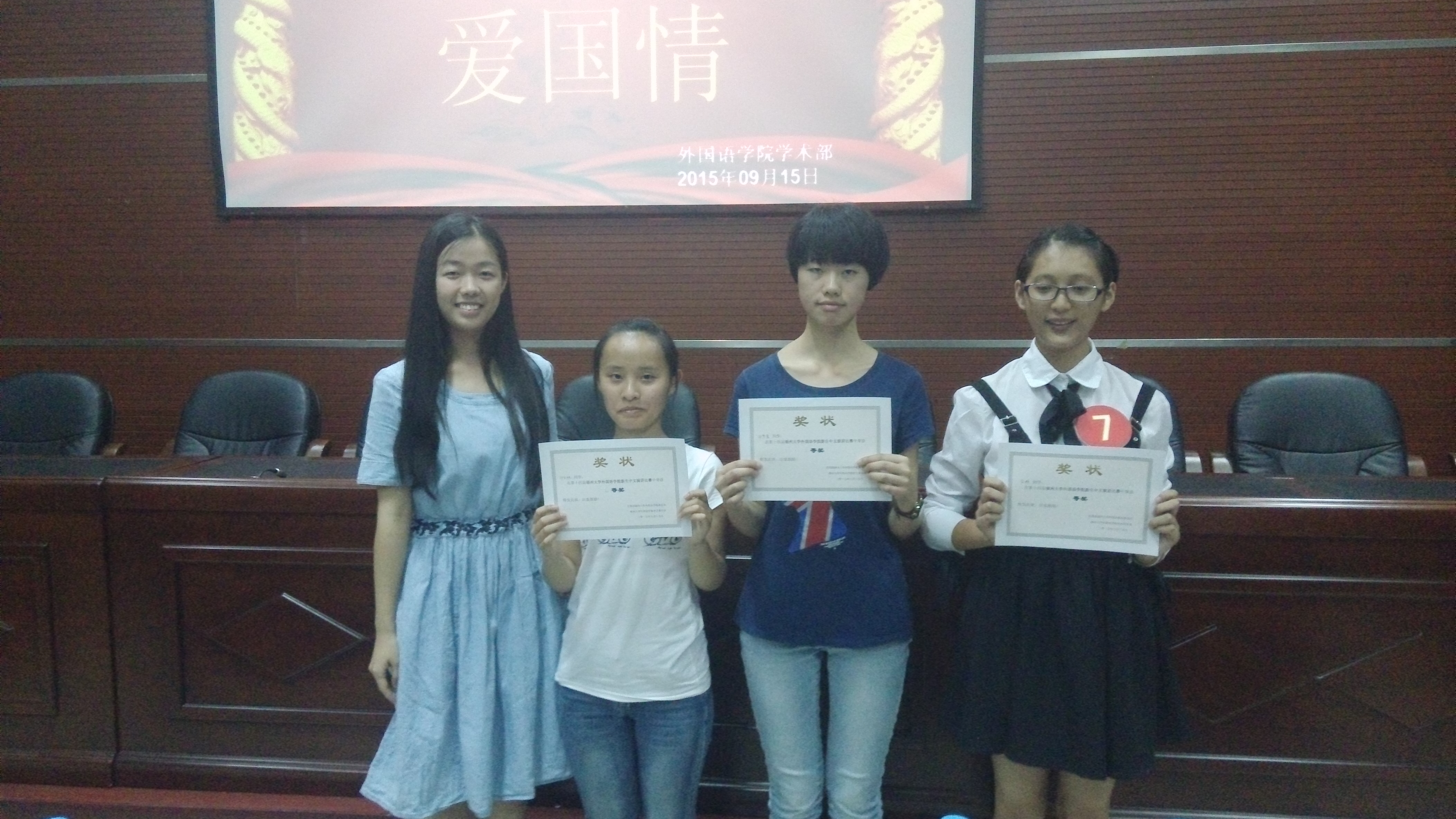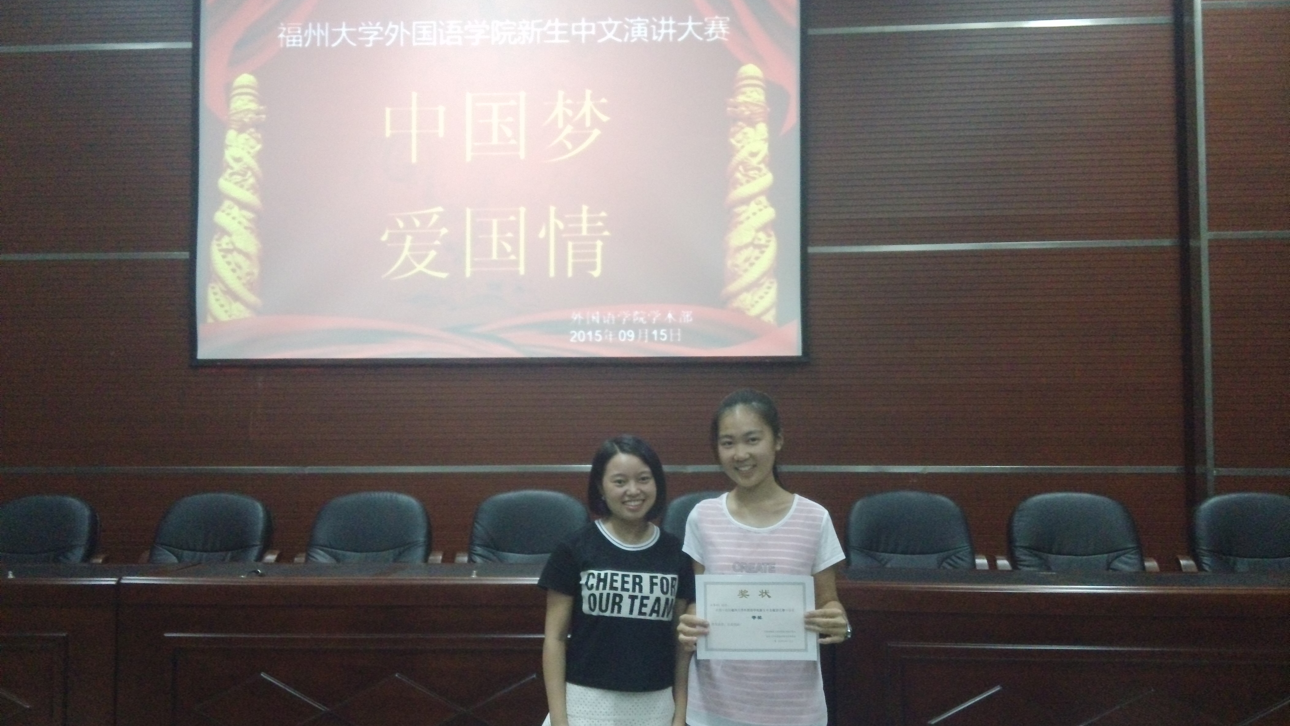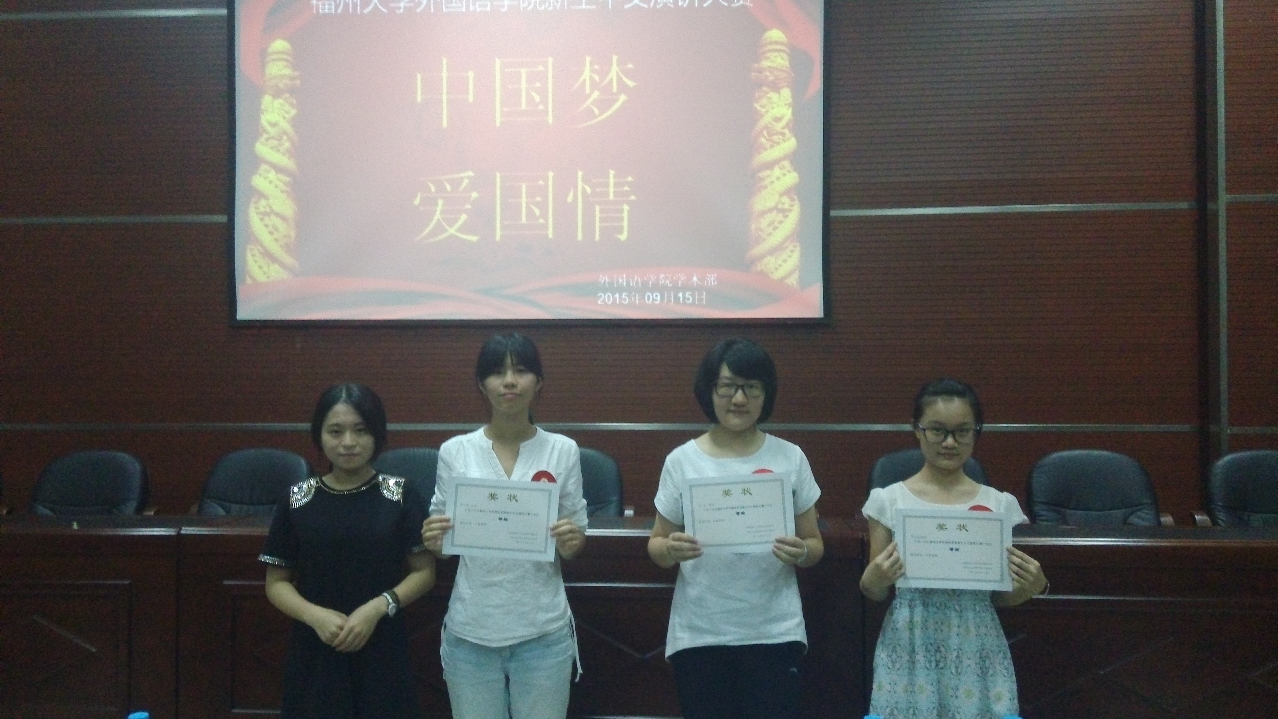 9月15日晚7时,太阳集团tcy8722在院办大会议室举办以“中国梦,爱国情”为题的新生中文演讲大赛,担任本次比赛的评委有2013级学生黄智婷,2014级学生张一佳、吕师涵。本次比赛吸引了很多同学前来观看,现场座无虚席。
