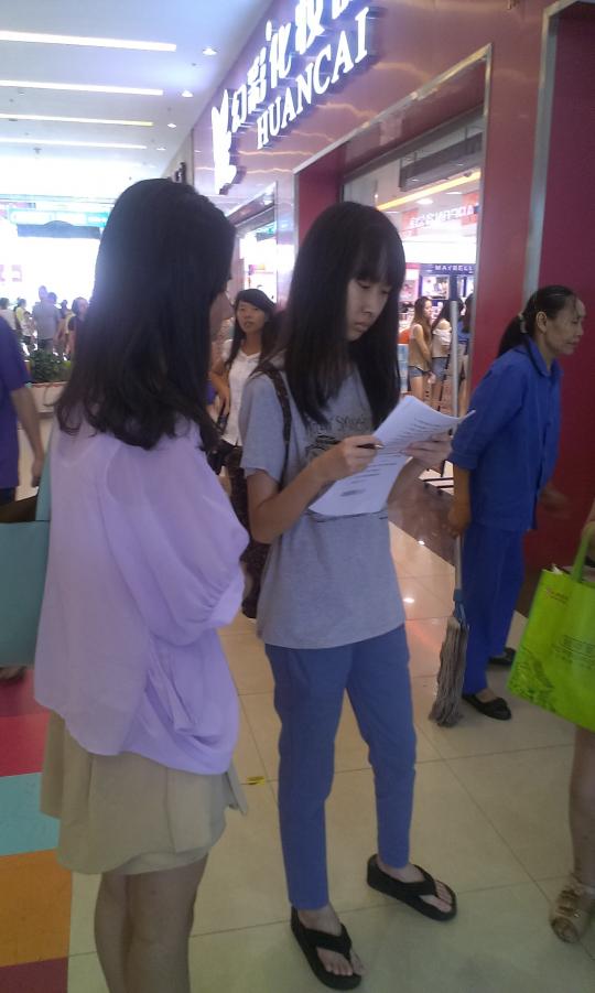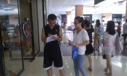 月18日下午,由4名成员组成的太阳集团tcy87222012级英语三班暑期实践小组于福州宝龙城市广场开展暑期社会实践“