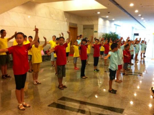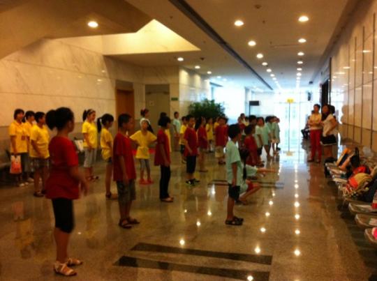 首先进行的是形体、发声训练,苹果队,芒果队和蓝莓队的小朋友们分别排成队伍开始形体培训。志愿者们在活动中帮忙搬动音响,控制音响的开关,帮助活动顺利进行。接着,三队集合到博物院一楼大厅,开始《多彩多姿的中国传统服饰》的讲座。讲座由福建博物院的志愿者潘少芳老师主讲,潘少芳老师从